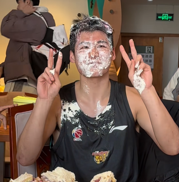 准备工作做完后,主力的人员还是胡明轩、徐杰、萨姆纳和杜润旺,他们狠狠将陈家政摁在蛋糕上。这个时候徐杰慢了一点,他当时还在品尝蛋糕呢,队友就下手了,最后才匆匆上手。